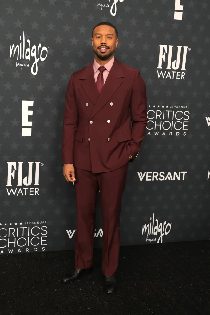 Michael B. Jordan embraced a rich burgundy double-breasted suit, paired with a crisp shirt, striped tie, and classic black derbies.