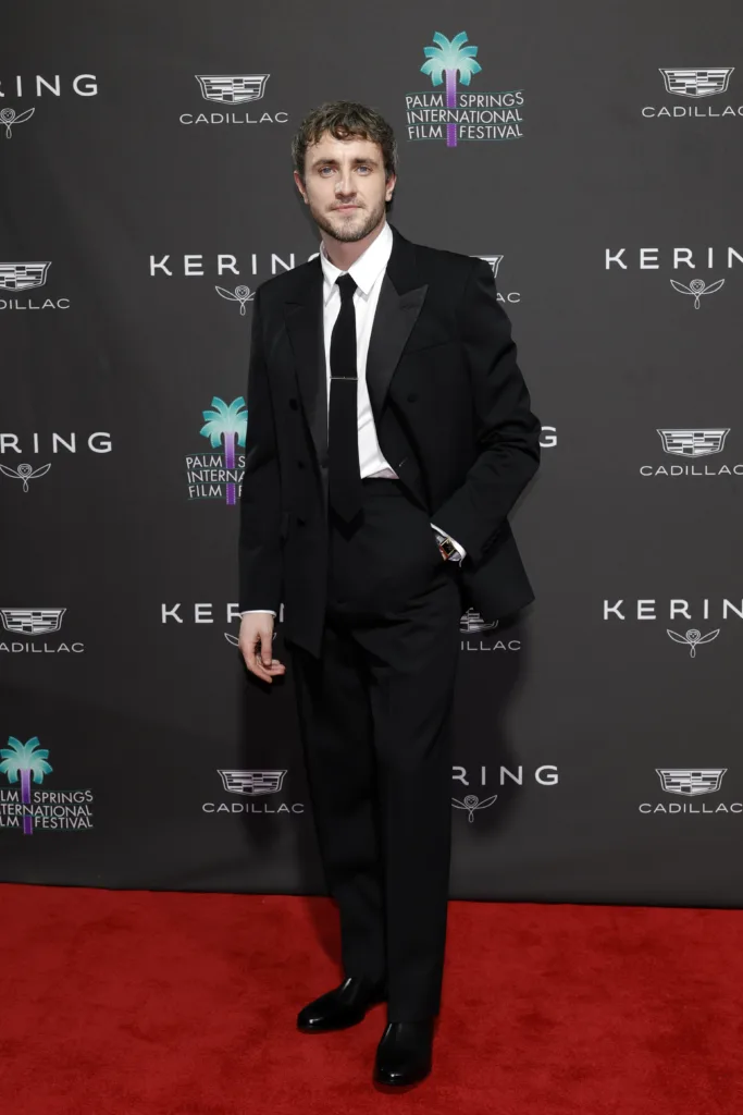 Paul Mescal rounded out the list in a custom Gucci black double-breasted tuxedo, white shirt, black tie and custom black leather boots, showcasing refined elegance with a modern edge.